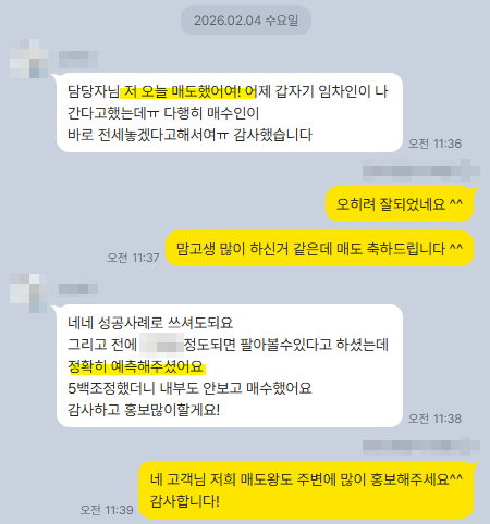 ※ 본 후기는 실제 고객님의 동의를 받아 작성되었으며, 고객님 요청에 따라 단지명·정확한 주소·동호수·호가·실거래 금액·임차 법인 정보 등 식별 가능한 정보는 모두 비공개 처리되었습니다. 매물 보러 온다는 연락을 대신 받고 이후 피드백을 전달드리는 것은 대행 방식에 한합니다. (대행을 원하시는 분은 별도 문의 주세요.)