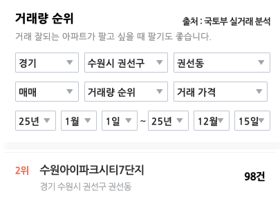권선동 거래량 순위 2위가 7단지로 총 98번의 손바뀜이 일어났어요