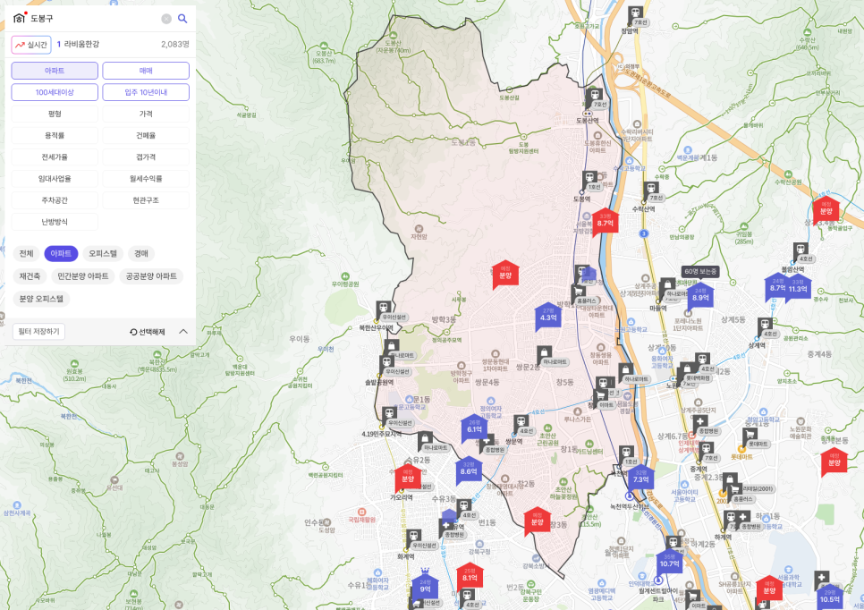 위의 이미지는 도봉구의 최근 10년 내 100세대 이상 아파트를 보여주는데요